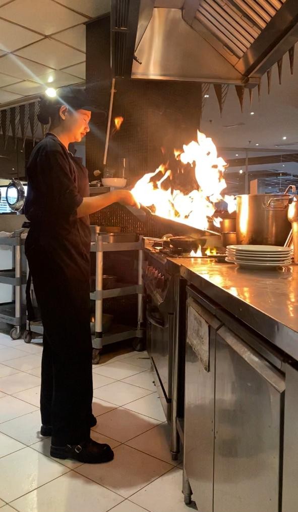 Selama pelaksanaan live cooking, mahasiswa magang melakukan berbagai tahapan kerja, mulai dari mise en place, persiapan peralatan dan bahan baku, proses memasak, hingga menjaga kebersihan dan kerapian area live cooking. Seluruh kegiatan tersebut dilakukan sesuai dengan standar operasional prosedur (SOP) Hotel Morazen Surabaya, termasuk penerapan hygiene sanitasi dan food safety yang menjadi prioritas utama dalam pelayanan makanan.