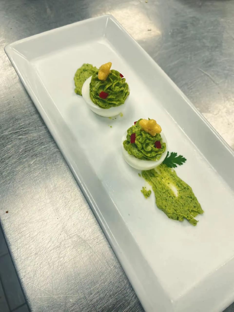 Menjelang perayaan christmas yang identik dengan suasana hangat dan kebersamaan, mahasiswa kemudian mengembangkan stuffed egg dengan sentuhan tema christmas. Hidangan ini diolah dengan memadukan kuning telur rebus dan mayonaise sebagai dasar isian, kemudian dikombinasikan dengan spinach dan garlic untuk menghasilkan rasa yang ringan, earthy, dan khas. Proses ini bertujuan menghadirkan appetizer yang tidak hanya berfungsi sebagai pembuka , tetapi juga mampu memberikan pengalaman rasa yang berkesan bagi tamu saat perayaan christmas.